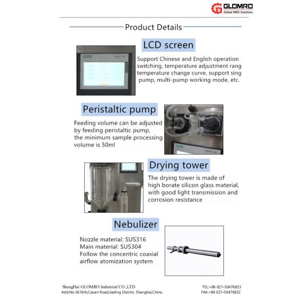 The experimental spray dryer (small spray dryer) has a compact design and can be placed independently in a laboratory or placed on a specially designed stainless steel rack. It is self-contained and can be operated without other facilities. One-button start-up, large color LCD touch screen operation, two operating modes, fully automatic or manual monitoring, can be used to facilitate operation and monitoring of the experimental process. It is currently a spray dryer with the smallest volume, the least noise and excellent drying effect.